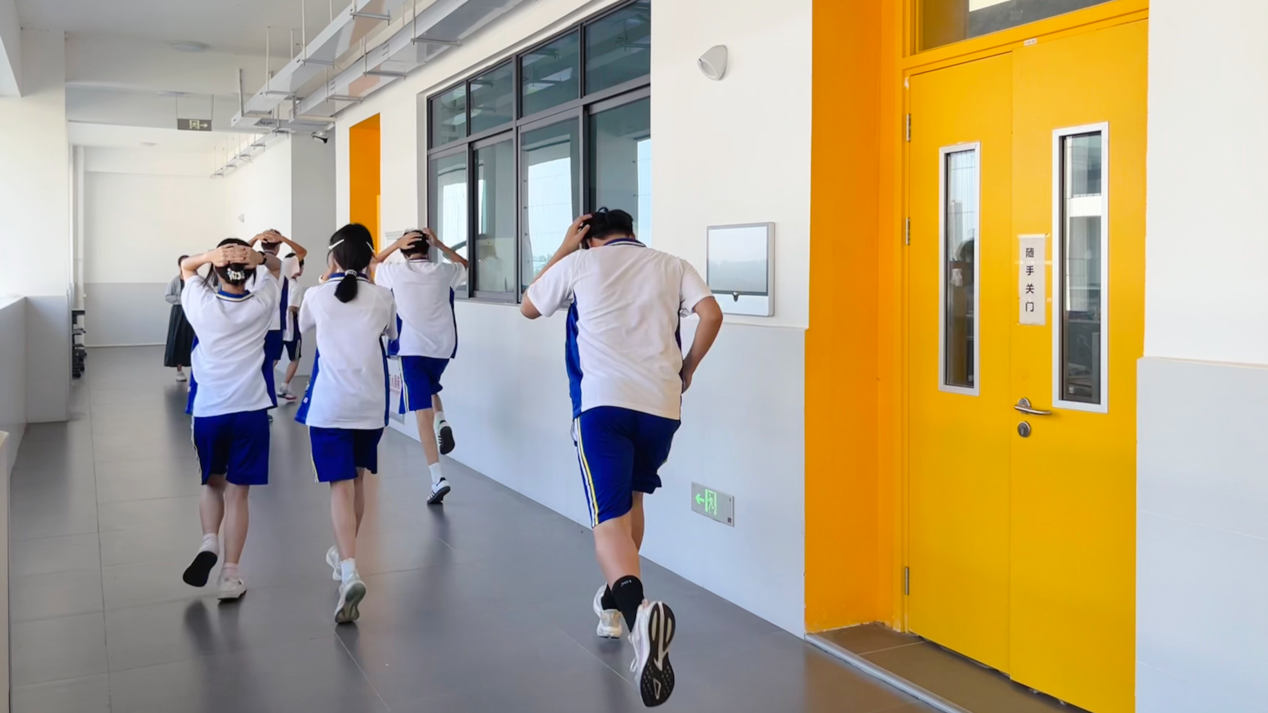 9点整,随着预先警报(鸣36秒,停24秒,反复3遍)在校园上空凄厉响起,演练正式拉开帷幕。课堂教学立即停止,全体学生在任课教师和班主任的指挥下,迅速反应,双手护头,就近迅速有序跑到空旷地方紧急避险。6分钟后,空袭警报(鸣6秒,停6秒,反复15遍)响起。学生们在老师的引导下,按照预定疏散路线,弯腰低身,沉着冷静、快速有序地从各教学楼向指定的安全集结区域——学校操场转移。各楼梯口、转弯处均有预先安排的教师和安全员值守,指挥疏导,防止拥挤、踩踏事故发生。整个疏散过程紧张而不慌乱,迅速而有条理。
