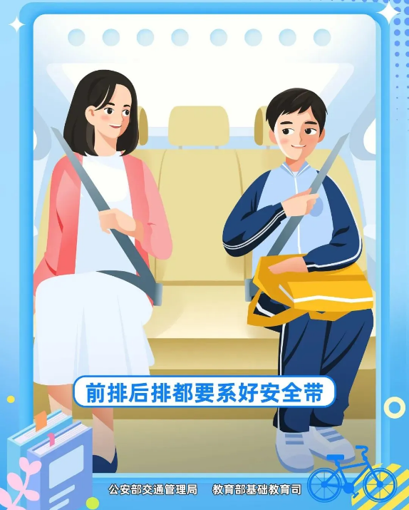 车上坐稳扶好,不将头手伸出窗外;下车前左右观察,从右侧缓行,避免“鬼探头”。安全带就是“生命带”,请一定系紧。